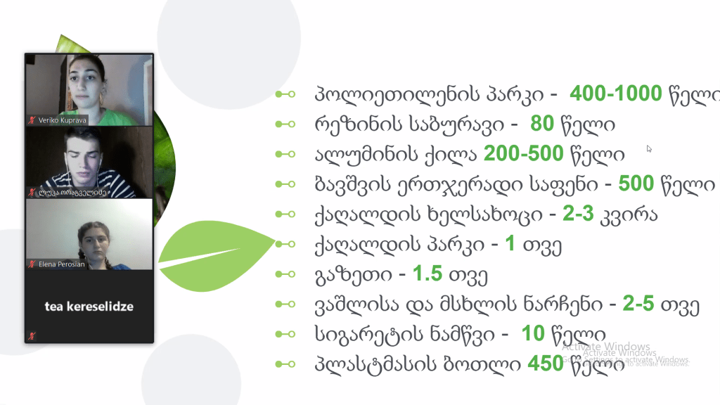 Club members invited an eco activitist – Veriko Kuprava. The meeting was on the topic of recyling. Participants watched some youtube videos and raised their awareness on the topic.